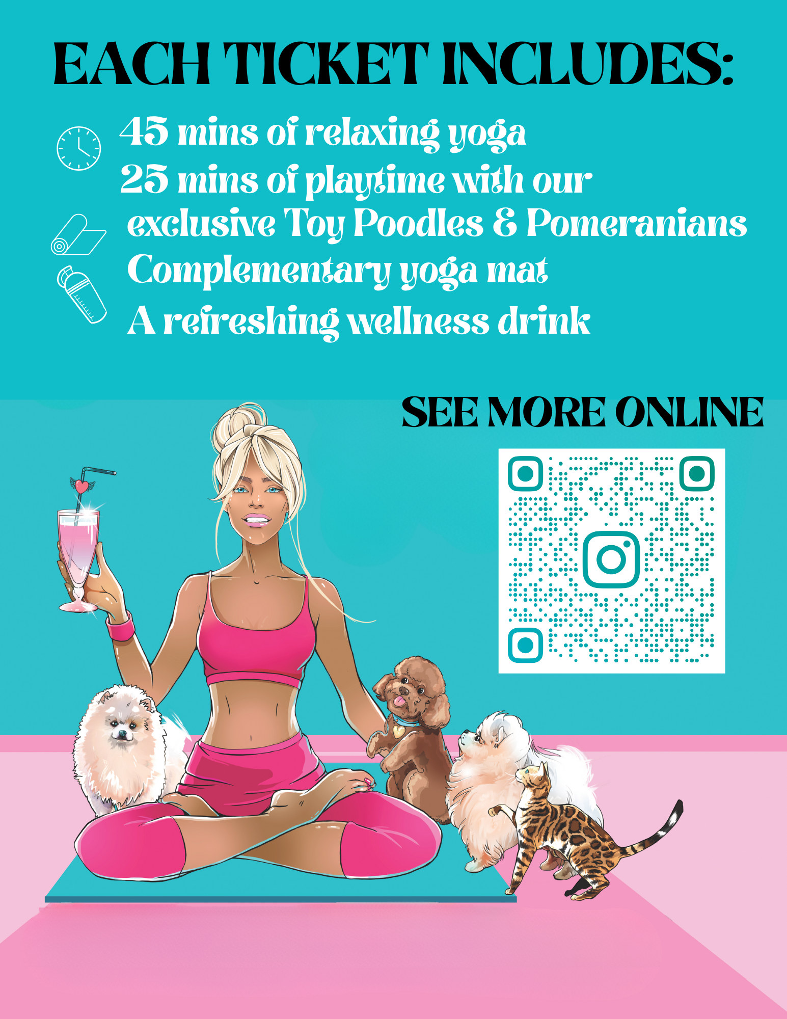 This 70-minute class includes 45 minutes of guided yoga suitable for all levels, followed by 25 minutes of dedicated puppy playtime – the perfect way to bond, take photos, and soak in the joy.